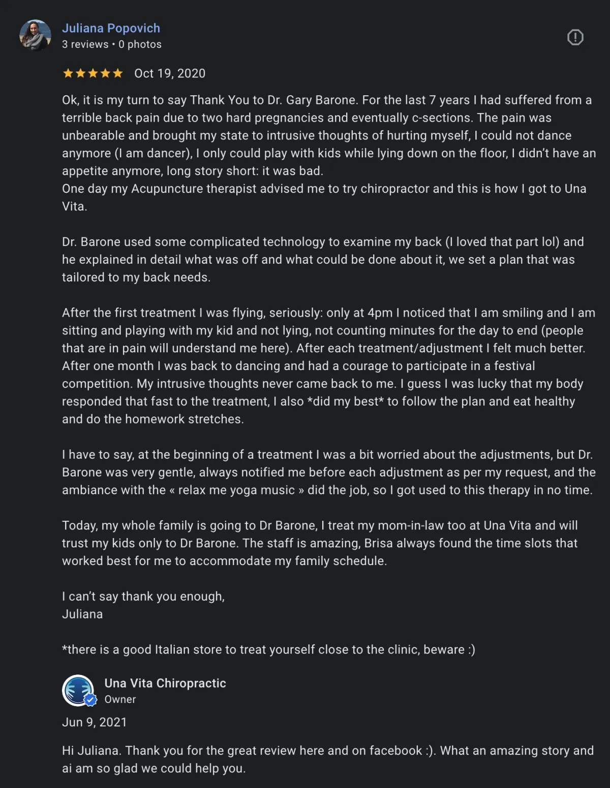 Can't say enough about Dr. Barone. I have gone from daily chronic headaches to virtually none and my overall health has improved immensely since I have started going here. Mi wife who had back issues has also seen a massive improvement in a very short period of time.